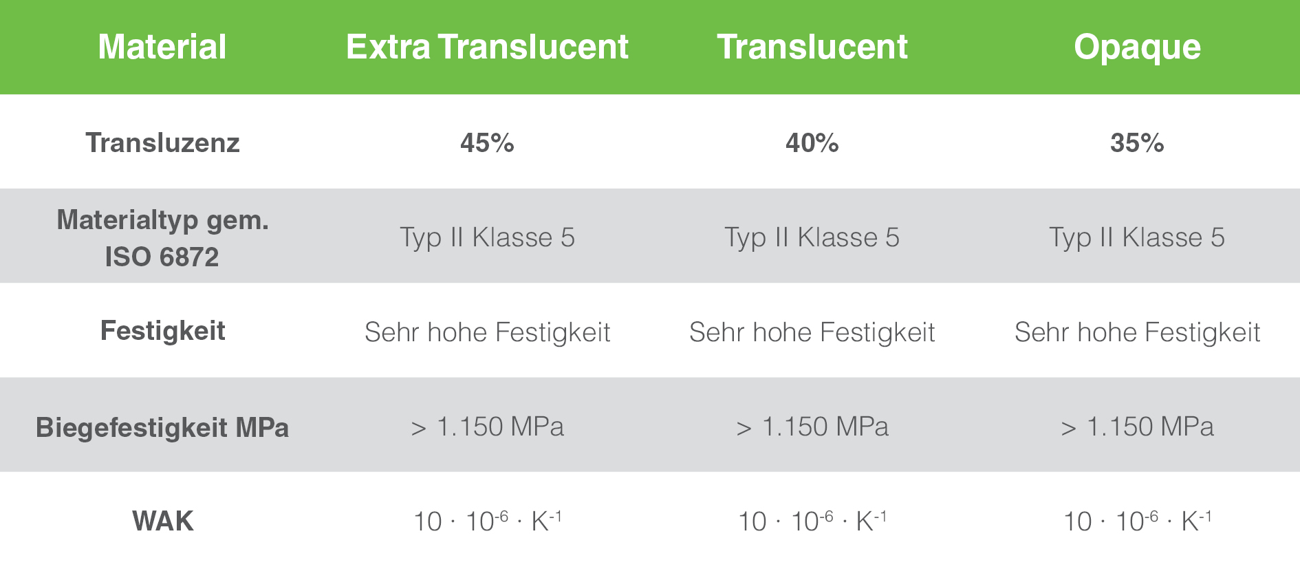 45 % Transluzenz, Biegefestigkeit > 1.150 MPa.