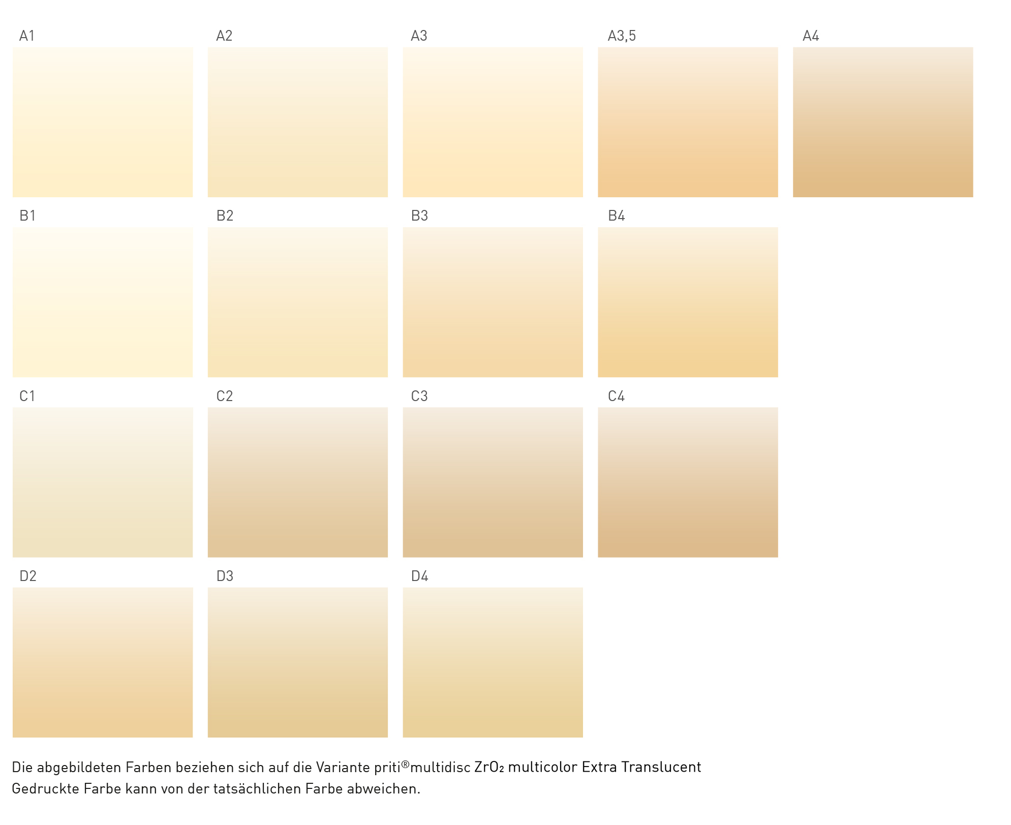 (4Y-TZP) in 7 Farbverläufen und 1 Bleachfarbe verfügbar. Damit können alle 16 Vita-Farben reproduziert werden.